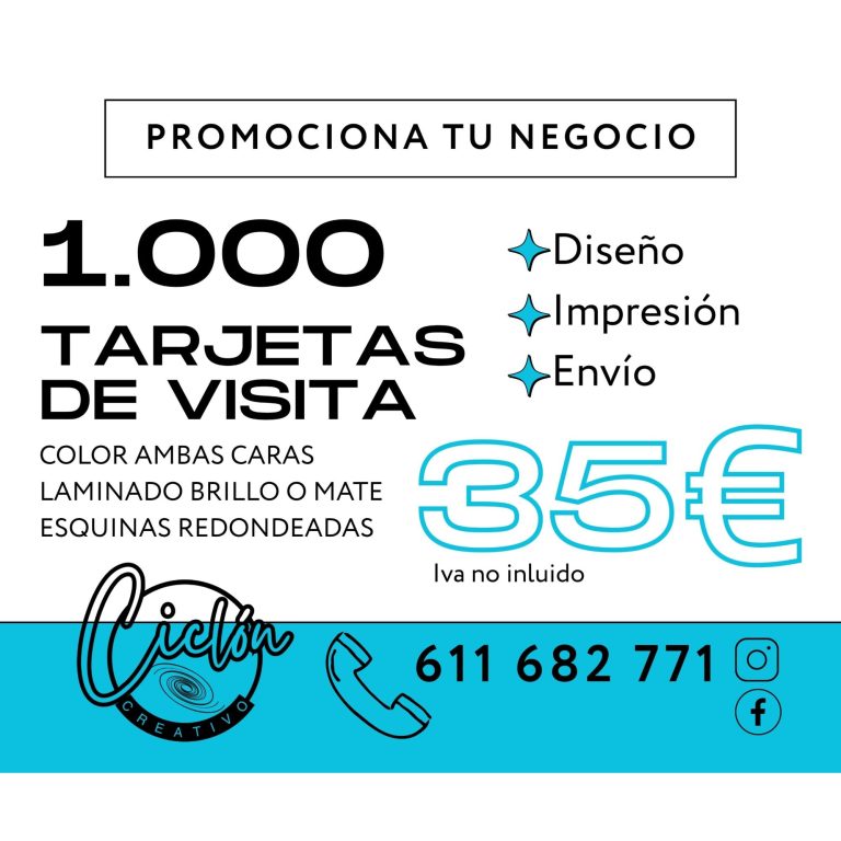 1.000 tarjetas impresas a color plastificadas por las dos caras, con las esquinas redondeadas para que no se deterioren, diseñadas para enamorar desde el primer momento. Date prisa, llámanos que el envío está incluido. ¡¡Todo por 35€!!